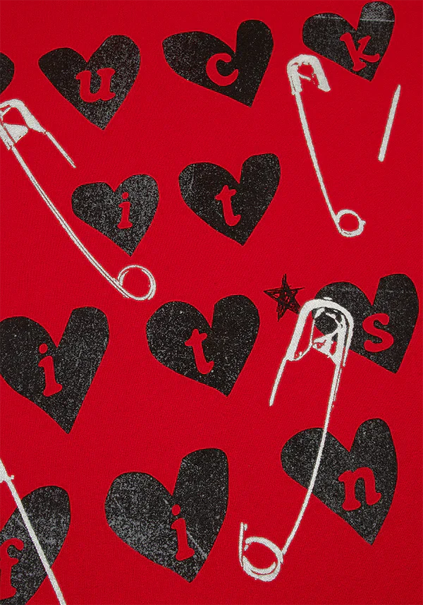 Kirschroter Kapuzenpullover mit Olivia Rodrigo „Fuck it, it's fine“ Siebdruck + Metallic-Druck auf Vorder- und Rückseite.