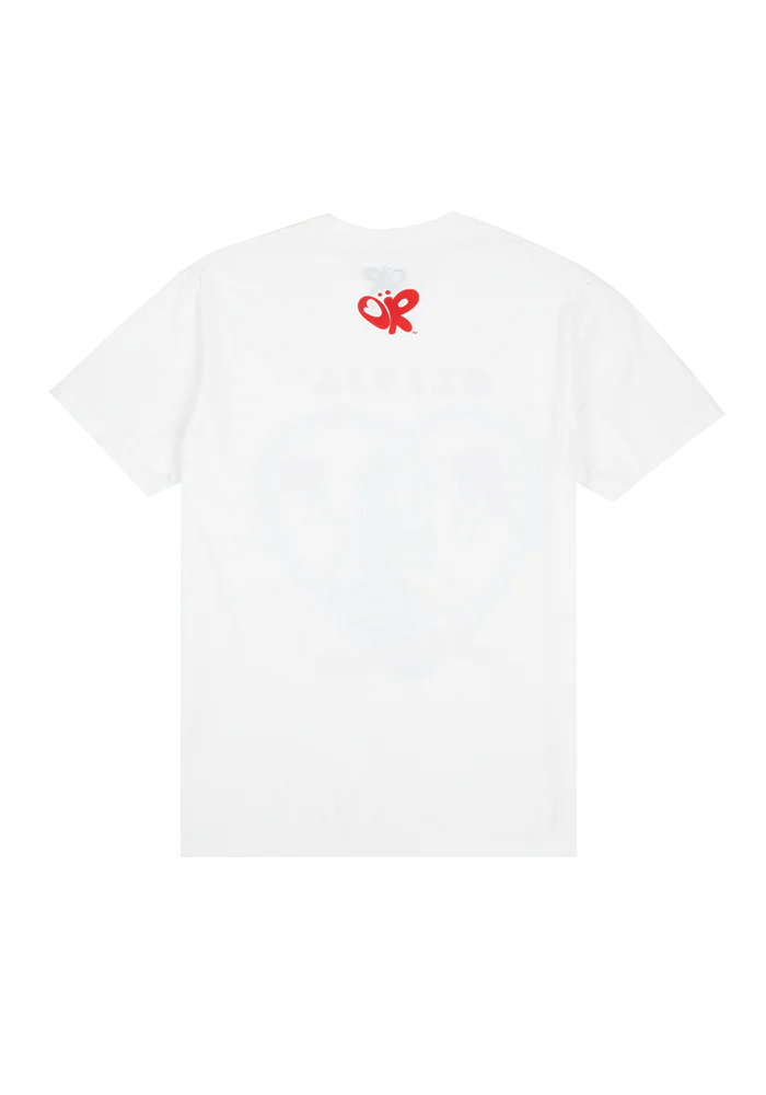 Weißes Unisex-T-Shirt mit Olivia Rodrigo „love is embarrassing“ Siebdruckgrafik.