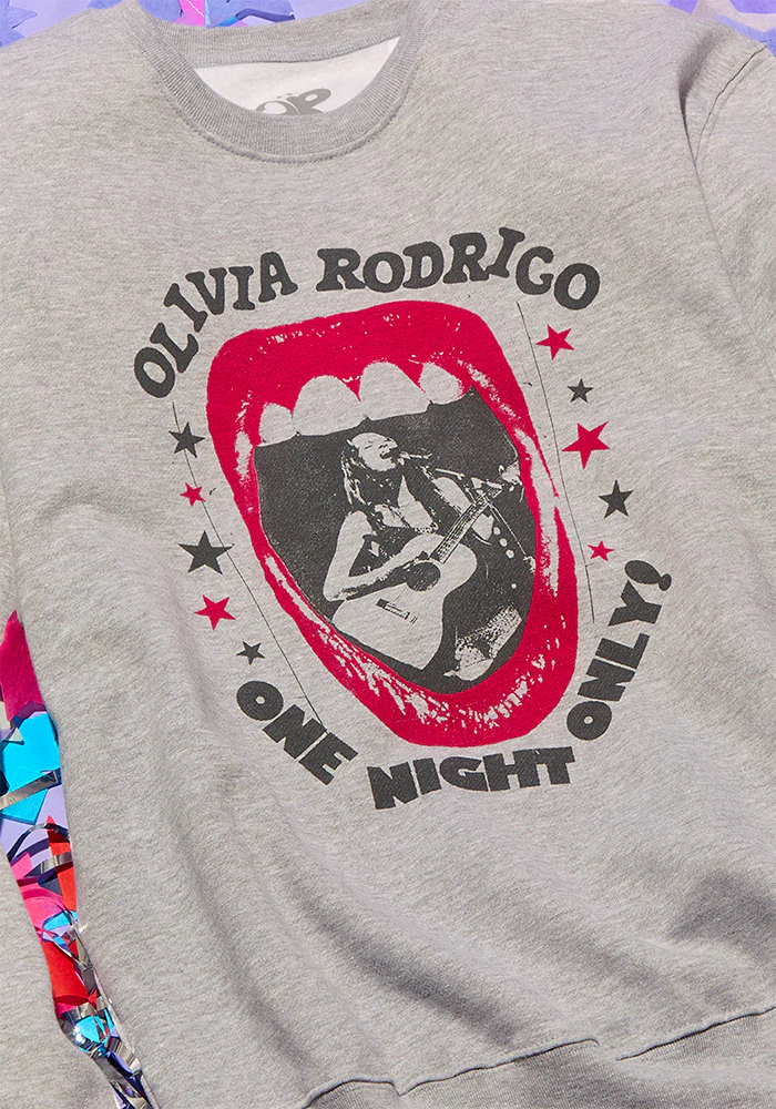 Sportlicher grauer Unisex-Pullover mit kastenförmigem Schnitt und Olivia Rodrigo „One Night Only!“-Siebdruckgrafik und Sternen auf beiden Ärmeln.